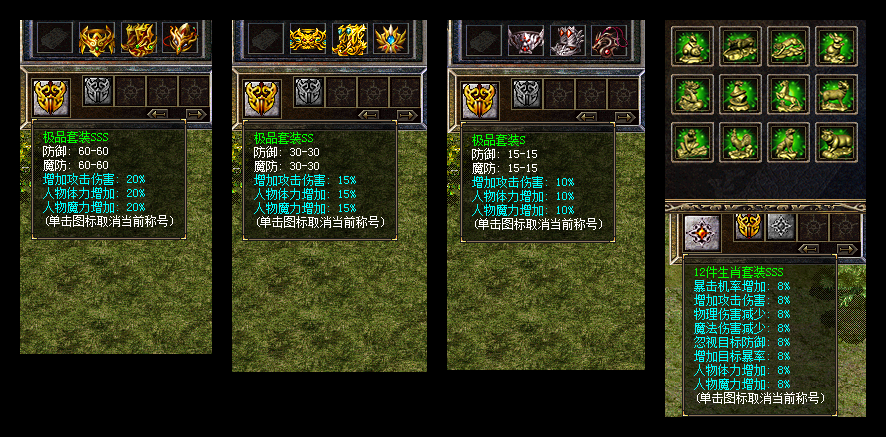 【极品套装】:穿戴8件,极品+3,极品套装: 增加攻击伤害20%,人物体力增加20%,人物魔力增加20%,防魔60-60! |
